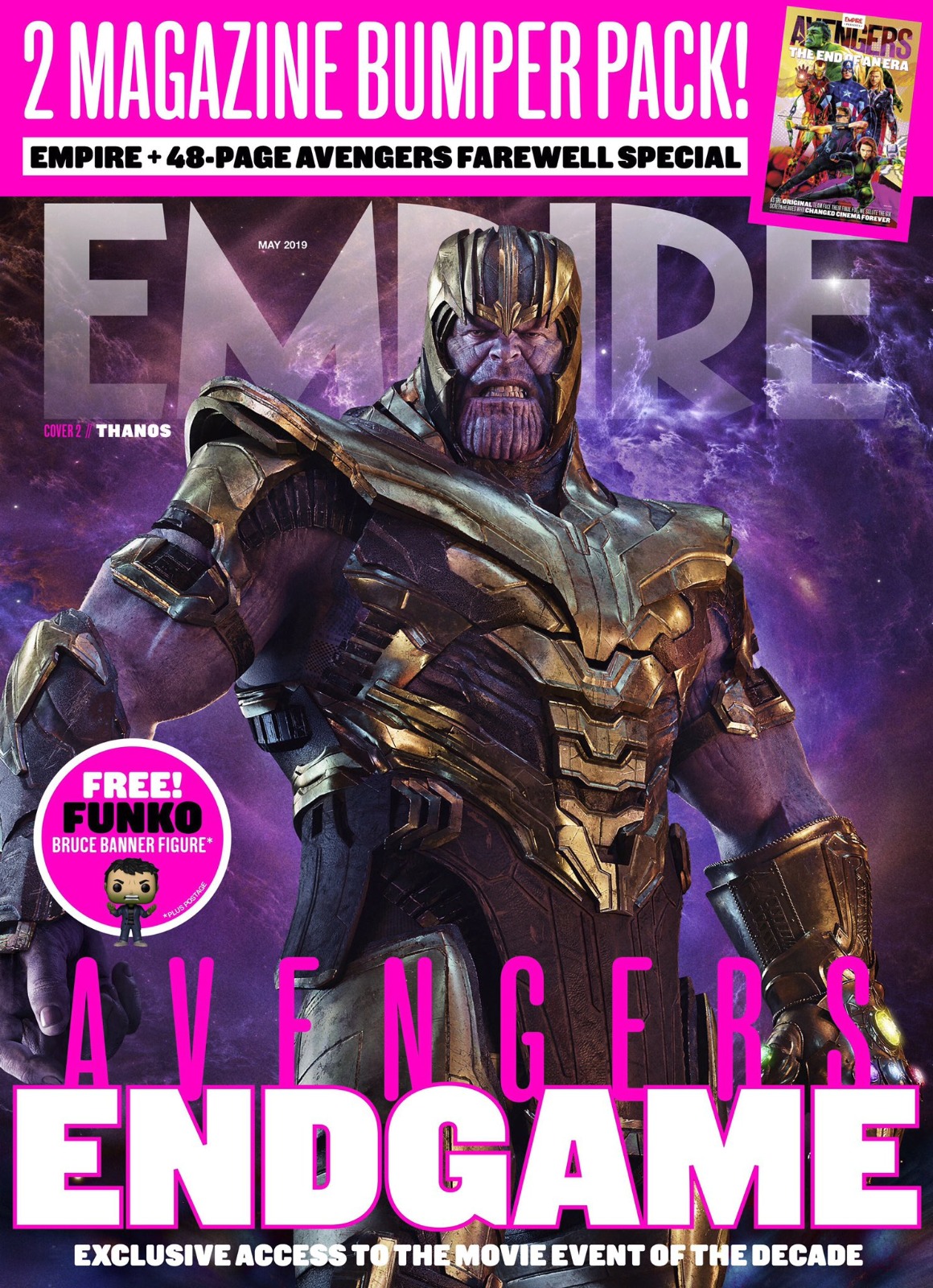 A nova edição da Empire vai com tudo no evento cinematográfico da década, um blockbuster de apostas mais altas que coloca a formação clássica dos Vingadores – Homem de Ferro, Capitão América, Thor, Hulk, Viúva Negra e Gavião Arqueiro – contra o próprio Titã Louco, Thanos. Essas linhas de batalha são refletidas nas duas capas de banca: primeiro, os Vingadores se reuniram para a missão mais importante de suas vidas.